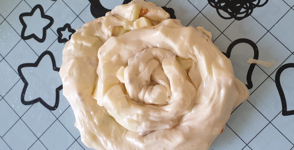 אחרי שעה וחצי פותחים את הבצק עם שמן על משטח סיליקון או שיש משומן. שיהיה ממש דק שקוף. מושכים ומותחים יותר ויותר. שלא ייקרע. חותכים לאורך באמצע לשניים. מפזרים לאורך בשורה ישרה את התפוחים, ממש מעט לא הרבה. מעל שמים פקאנים קצוצים. ללפף את הבצק סביב המלית, בסבלנות. לגלגל כמו שבלול. לשים בתבנית במרכז, וממשיכים לחתיכות האחרות שממשיכות את השבלול שבתבנית לאחד גדול.